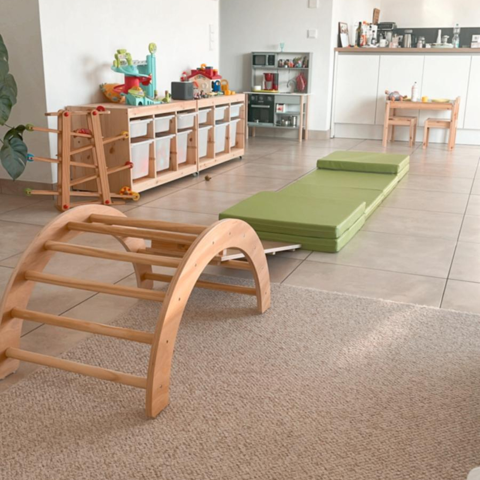 Die Fenster im Erdgeschoss reichen bis zum Boden, dadurch bekommen die Räumlichkeiten viel Licht, was uns gute Laune macht, sogar im Winter. Alle Räumlichkeiten sind kindgerecht eingerichtet und laden zum Spielen und Entdecken ein. Ein Angebot an Büchern, Spielsachen und Klettergerüst, steht den Kindern immer zur Verfügung.